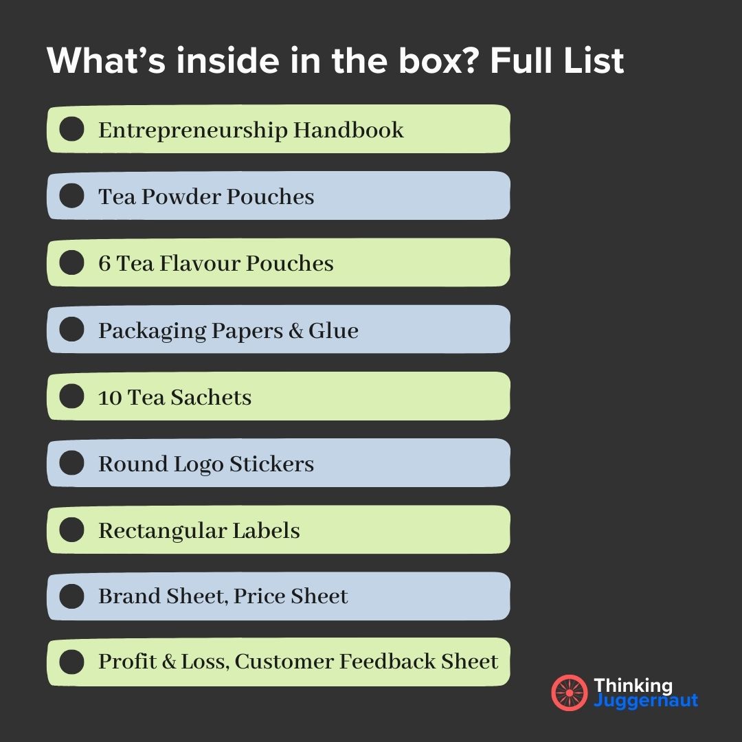 The kit includes an Entrepreneurship Handbook, tea powder pouches, tea flavour pouches, packaging papers with glue, empty tea sachets, logo stickers, labels, and worksheets for branding, pricing, profit & loss, and customer feedback. Everything required to make and launch a small tea brand is included.