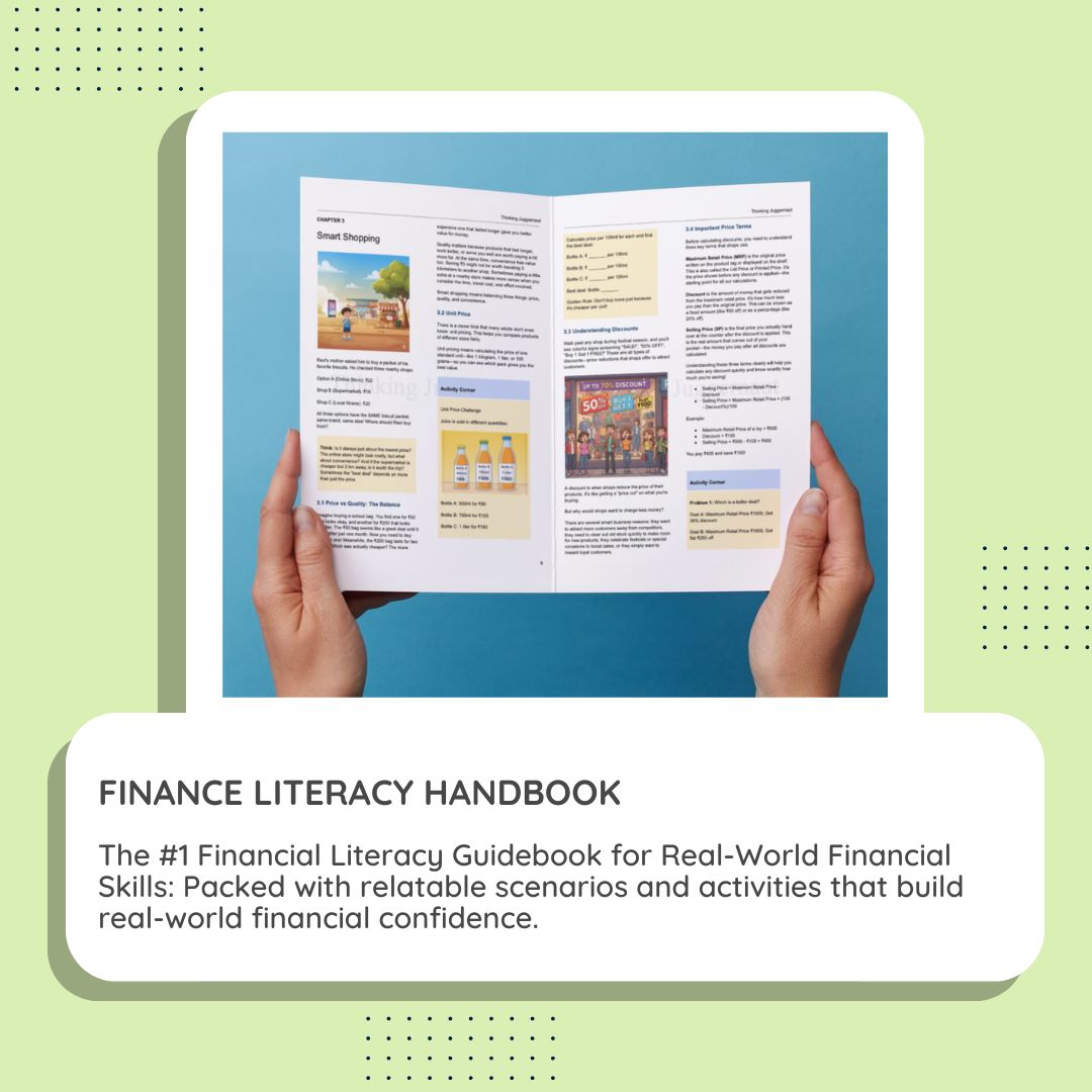 The kit includes a full-colour financial literacy handbook, 20+ practical activities, reusable flashcards, and a Save–Spend envelope system. Everything needed to make finance understandable, relatable, and easy to apply in everyday situations is included.