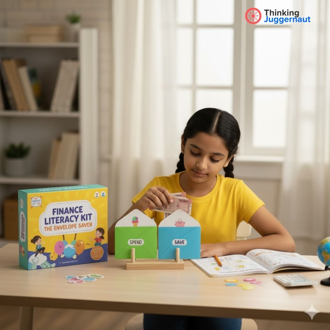 Kids learn the basics of money, value, saving, spending and smart decision making while building confidence to handle finance later in life. Don't wait till adulthood to teach your child about money and finance. The kit comes with a full-colour financial literacy handbook featuring 20+ hands-on activities, flashcards, and a Save–Spend envelope system so children can apply what they learn through real-life scenarios, challenges, and thinking tasks.