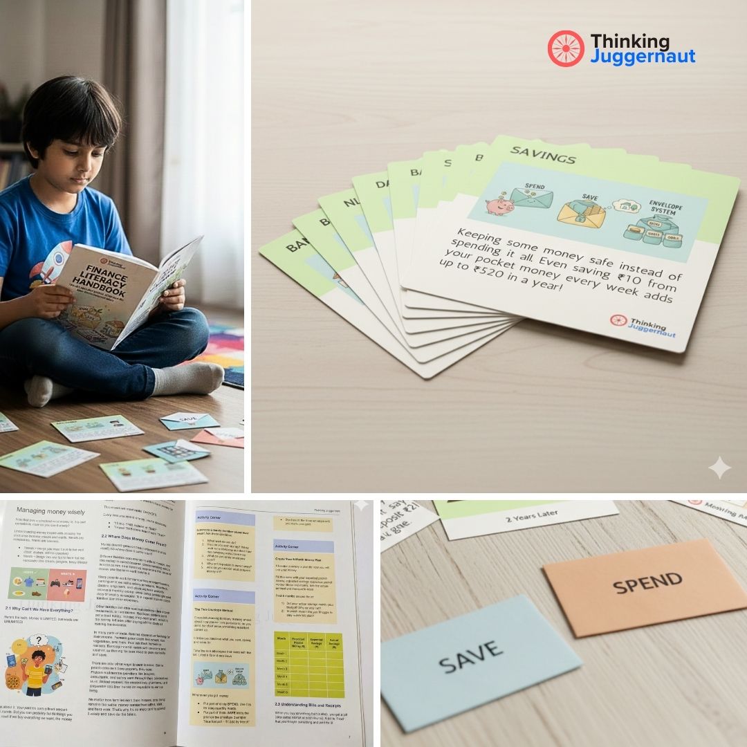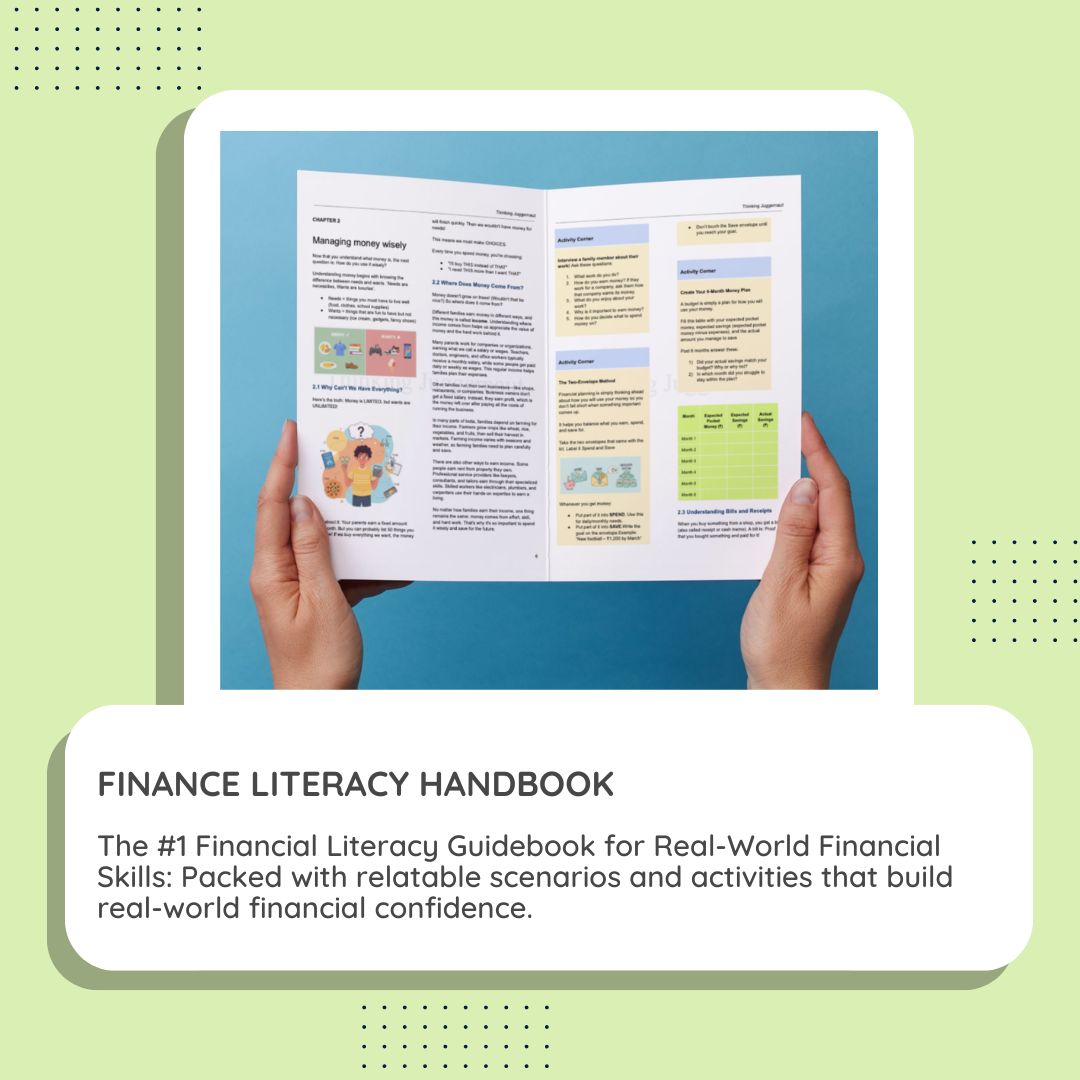 You receive a full-colour financial literacy handbook, 20+ hands-on activities, reusable flashcards, and a Save–Spend envelope system. Everything required to make personal finance simple, practical, and engaging is included.
